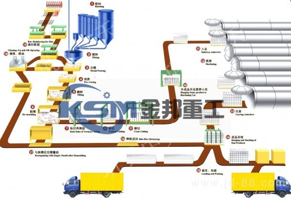 7 輔助設(shè)備⑴??颉⒌装?、模具車 這些設(shè)備配合組成澆注模具,是加氣混凝土的主要成型設(shè)備。⑵蒸養(yǎng)車、擺渡車、吊具這些輔助設(shè)備是蒸壓養(yǎng)護系統(tǒng)所必須配備。